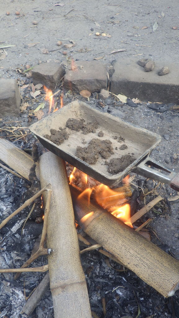 竹を箒のようにつかって、地面を掃除して落ち葉を集めたり、