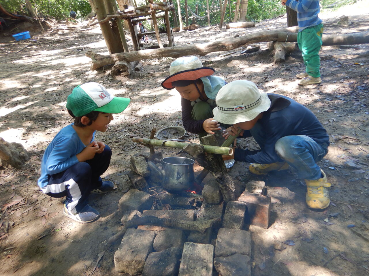 最初はちょっと薪にやかんのお尻がついてしまったので、レンガで高さを調節。