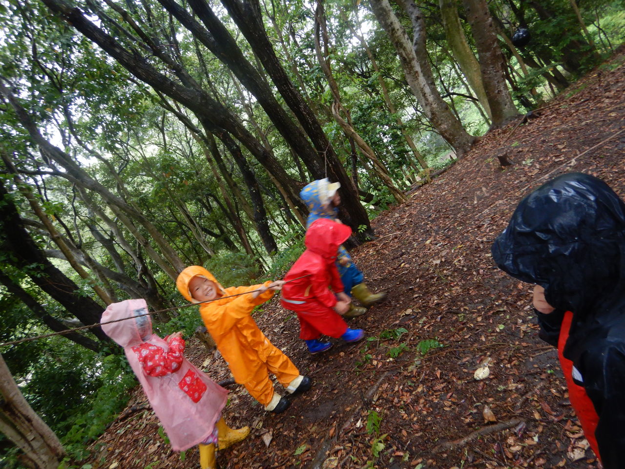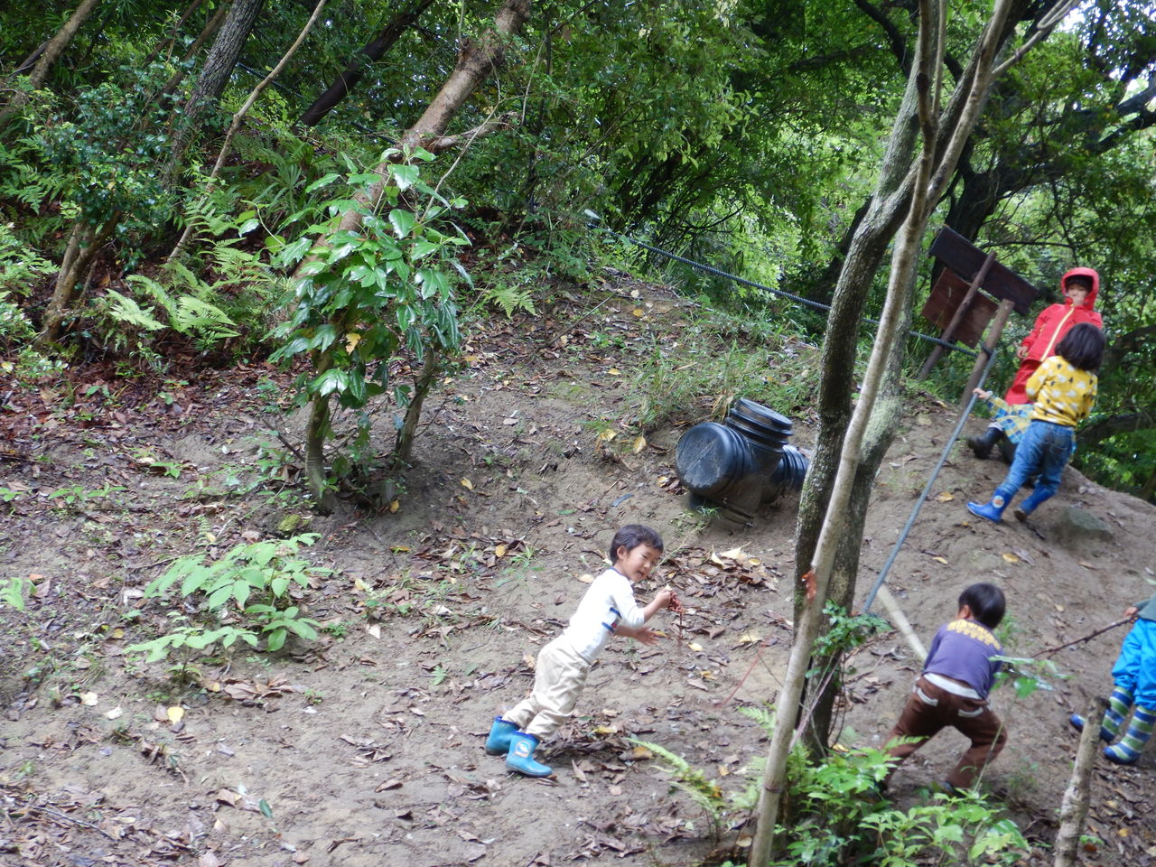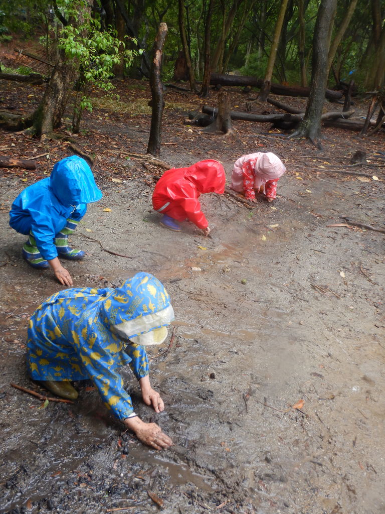 雨の中、森で笑う、いっくん。