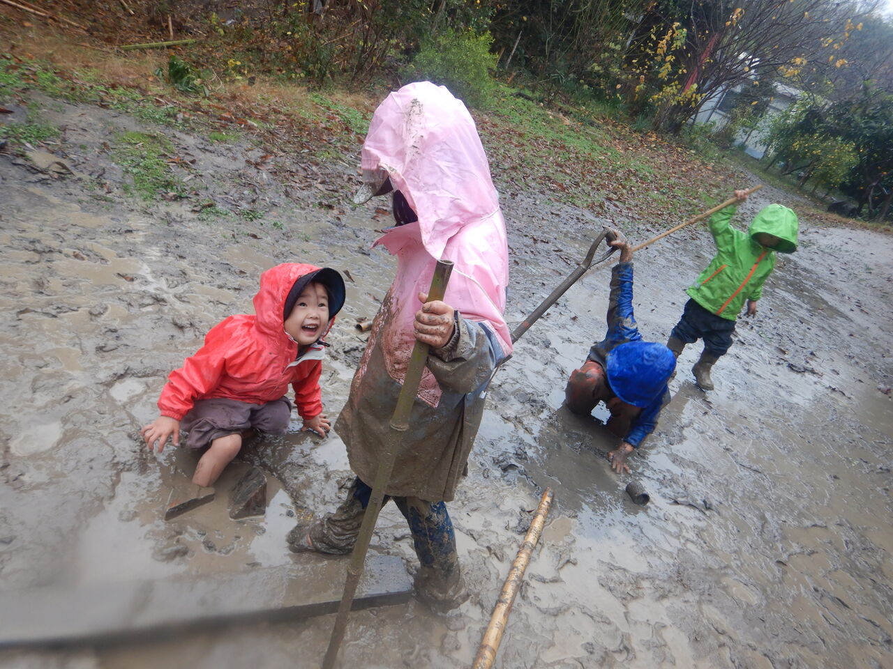 雨のおかげさまで、フィールドのあちこちに掘った穴で泥遊びが楽しすぎる。